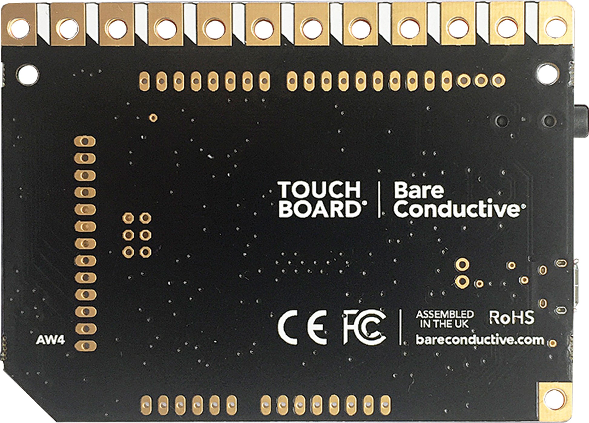 The touch board is a microcontroller board with dedicated capacitive touch and MP3 decoder ICs. It has a headphone socket and micro SD card holder (for file storage), as well as having 12 capacitive touch electrodes. It is based around the ATmega32U4 and runs at 16MHz from 5V. It has a micro USB connector, a JST connector for an external lithium polymer (LiPo) cell, a power switch and a reset button.