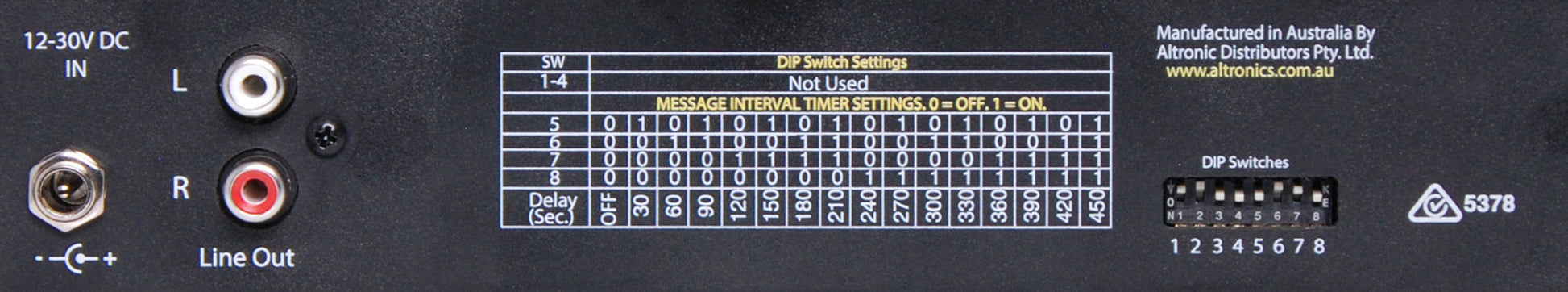 Message intervals can be adjusted between 30 seconds and 7.5 minutes. A standard stereo RCA line output is provided for easy connection to any existing PA or telephone system. Playback commences automatically when switched on and files play in the order in which they are named in the ‘music’ or ‘messages’ folders (ie alphanumeric).