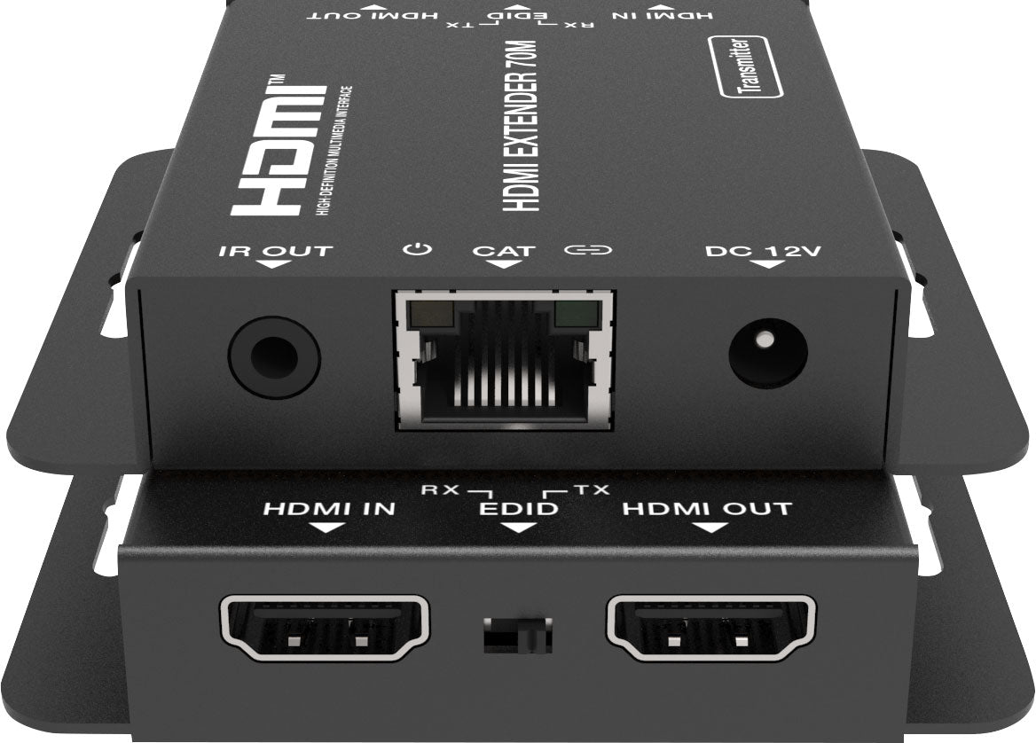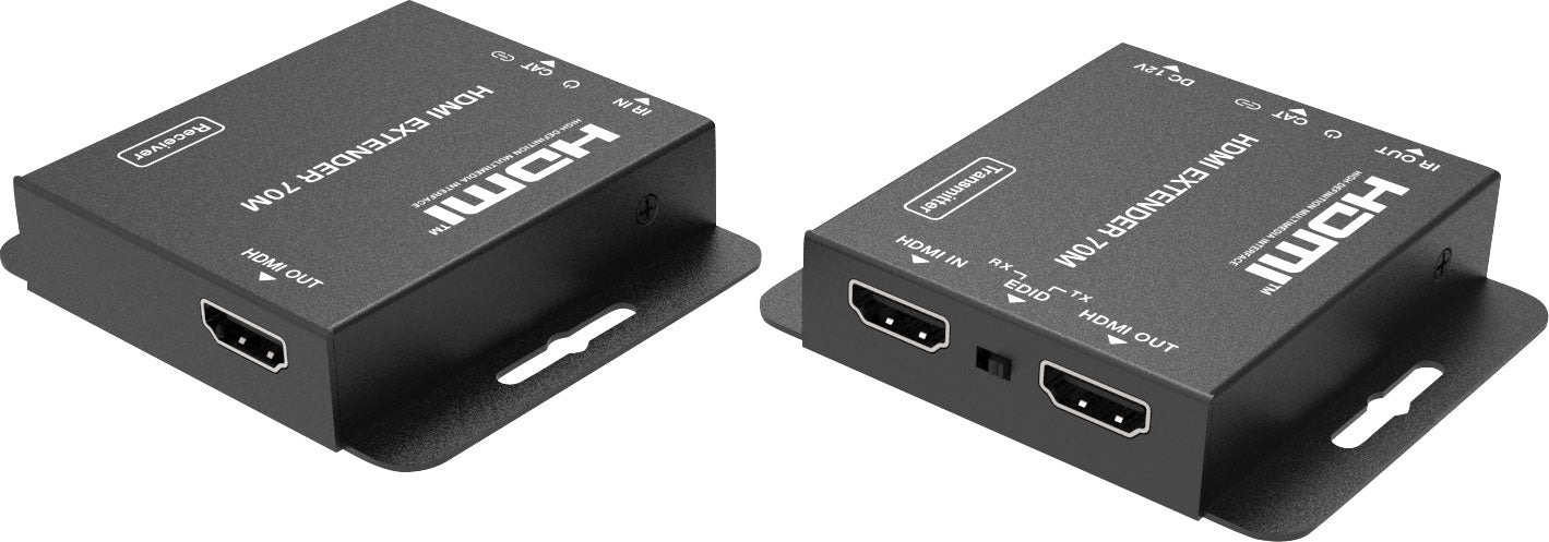 This extender can send HD video/audio signal and IR control up to 70m@1080p, and 40m@4K30 resolution via a single CAT5e/6 cable with zero-delay and uncompressed transmission. The HDMI loop output can be cascaded to the next extender, supporting resolution up to 4K@30Hz. Supports EDID copy function (you can choose local or remote EDID) and audio formats up to PCM7.1, Dolby True HD, DTS HD. Perfect for use in homes, conference rooms and education spaces. Dimensions: 79.5W x 69D x 16.5Hmm.