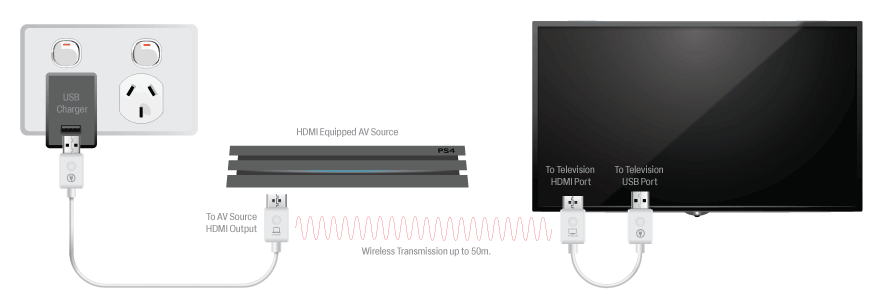 These wireless extension cables provide a simple way to send 1080p 60Hz signals from a HDMI source device to TV or monitor in another room up to 50m away (line-of-sight). All you need is USB power at each end, plug one HDMI into the source, and the other into your TV/monitor.