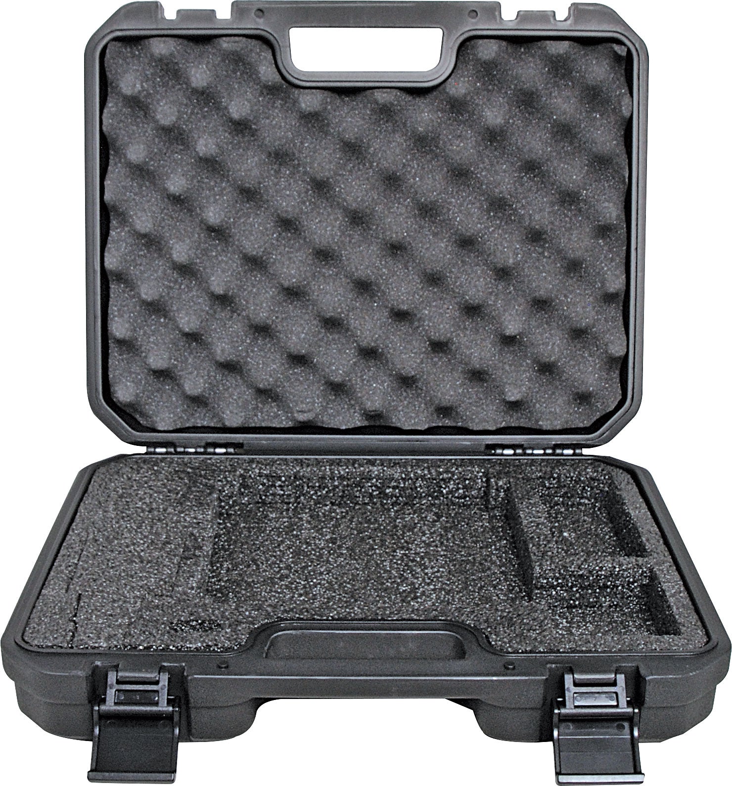 ABS injection moulded plastic carry case with pre-cut foam inserts for half rackmount wireless microphone systems. Can be used for tools and general equipment protection.