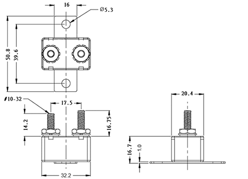 Single pole stud type 50A DC circuit breaker with surface mounting tabs. Ideal for use in vehicles. Auto reset. Current ratings at 12V/24V DC. Meets SAE J553 standard (Type 1). #10 - 32 UNF stud connection (Approx 4.75mm diameter). Includes hardware.