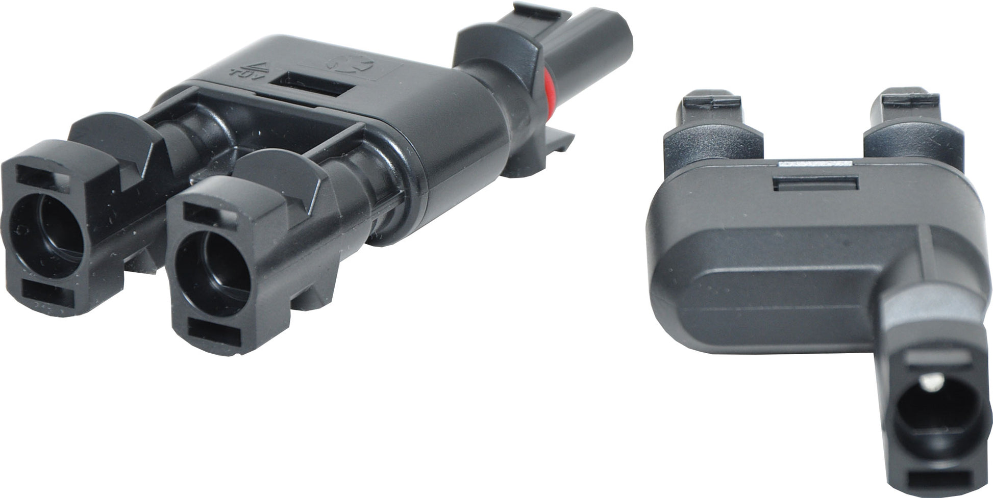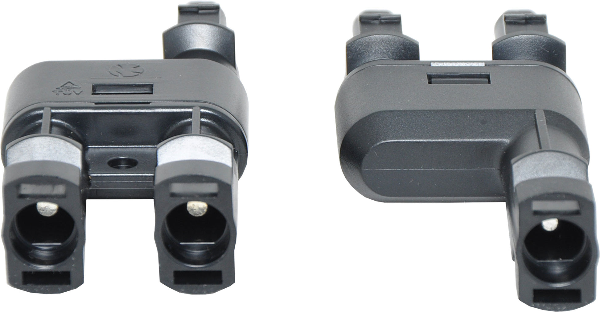 MC-4 dual line plug adaptor designed for use when daisy-chaining solar panels together. Water & dust proof - IP67 rated. Commonly used on photovoltaic solar panel arrays. Fully sealed design is suitable for use in exposed installations. Rated 30A @ 1000VDC (70°C).