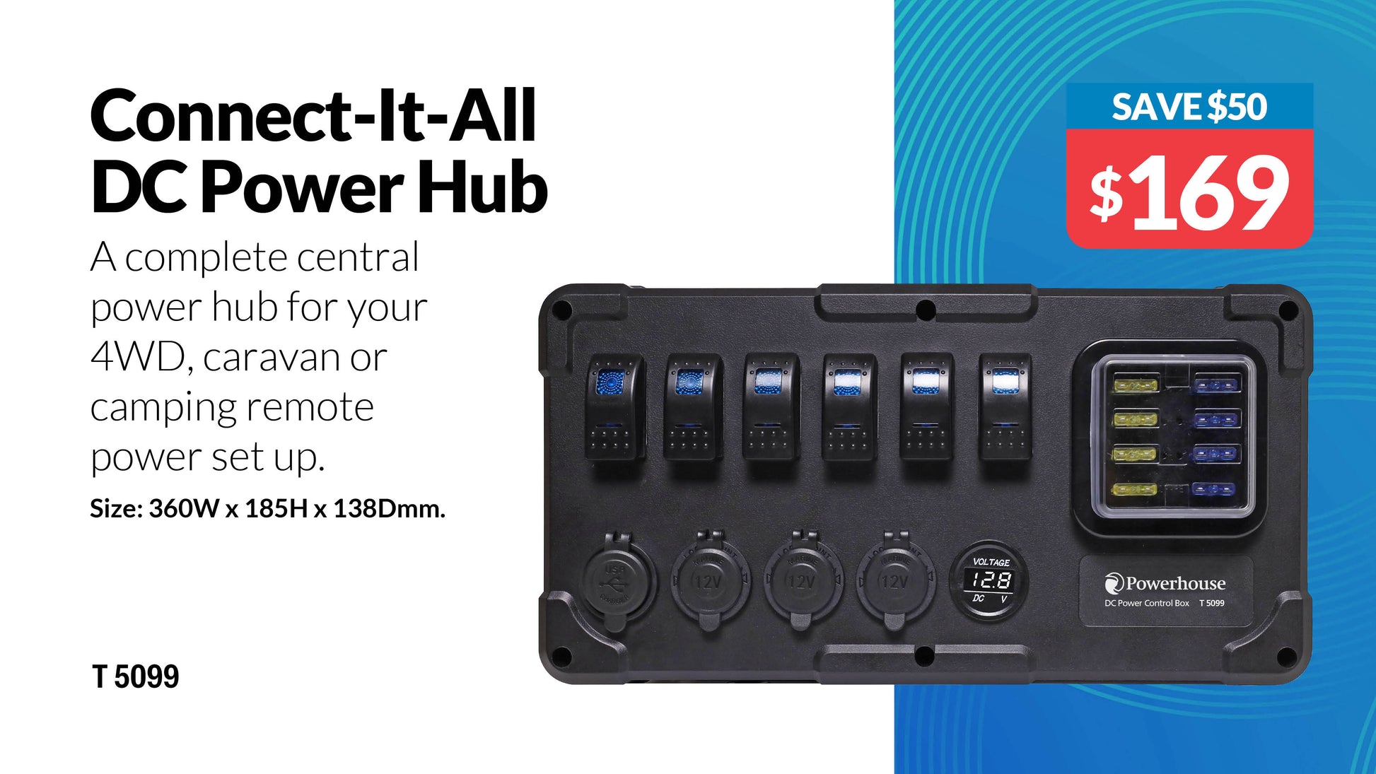 A complete central power hub for your 4WD, caravan or camping remote power set up. This box contains 6 contura style illuminated switches, 3 car accessory sockets (12V), USB charger, LED volt meter, all protected by a 6 way weatherproof fuse block. Solar and battery connections are provided by 2 Anderson SB50 style connectors which are individually fused with 30A blade fuses.