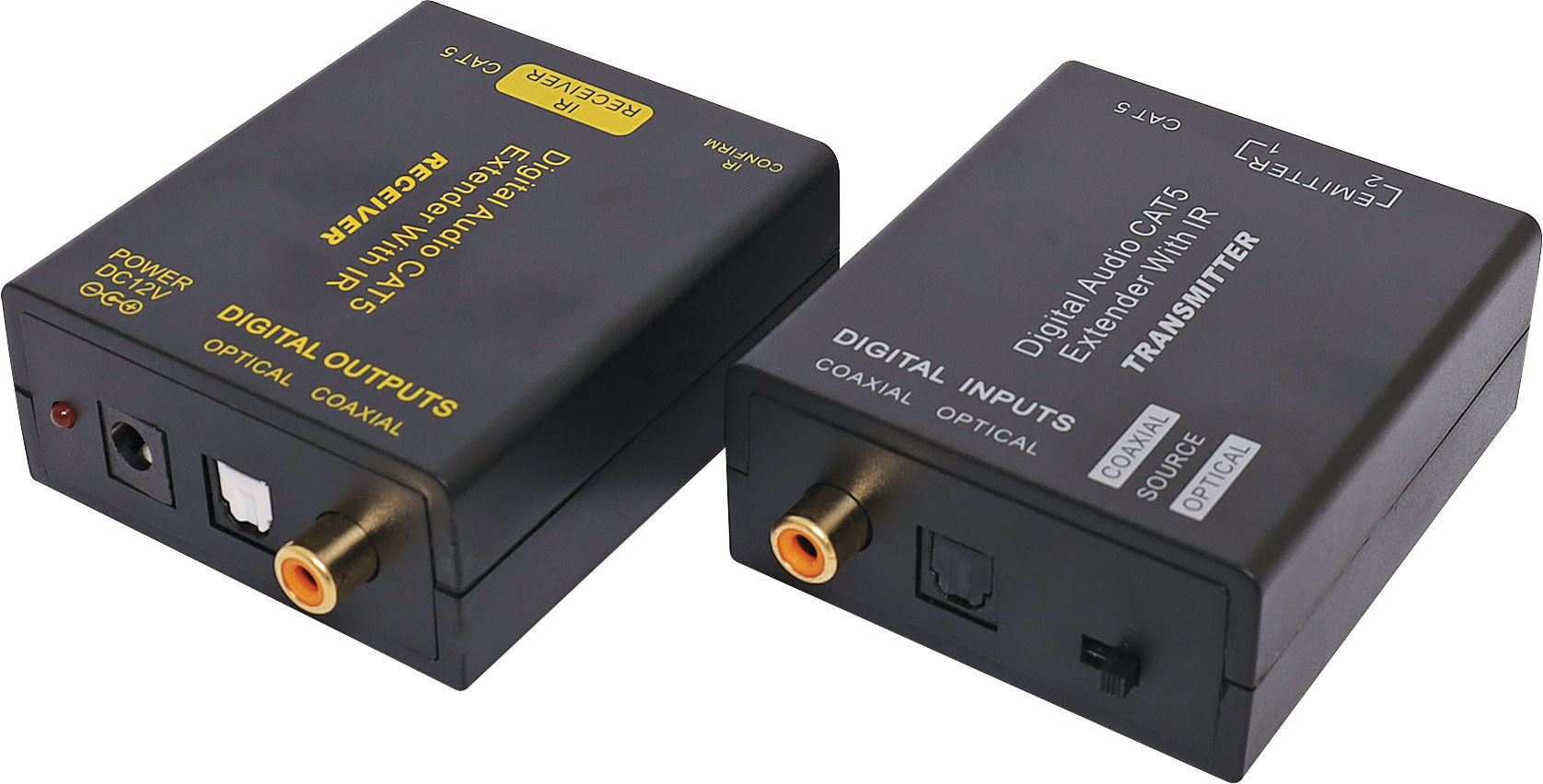 This Digital Audio Cat5 Extender Box allows digital signals to be transmitted using a single Cat5e or Cat6 cable. It also supports multichannel audio. Simply select one input from Coaxial or Toslink input ports, and send S/PDIF audio signal to both Coaxial and Toslink output ports simultaneously.