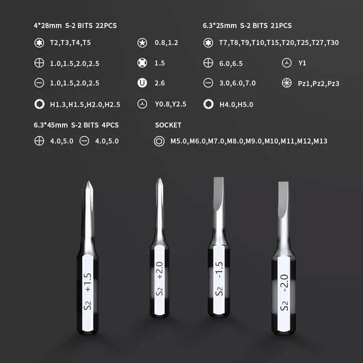This Professional 60 Piece Driver and Socket Set is ideal for bicycle repair, model disassembly, home assembly, home appliance repair, mechanical maintenance and digital product disassembly. The set contains 47 kinds of matte, chrome-plated screwdriver bits and 9 kinds of matte, chrome plated sockets. The set is enclosed in a magnetic closed box keeping everything neat and tidy.