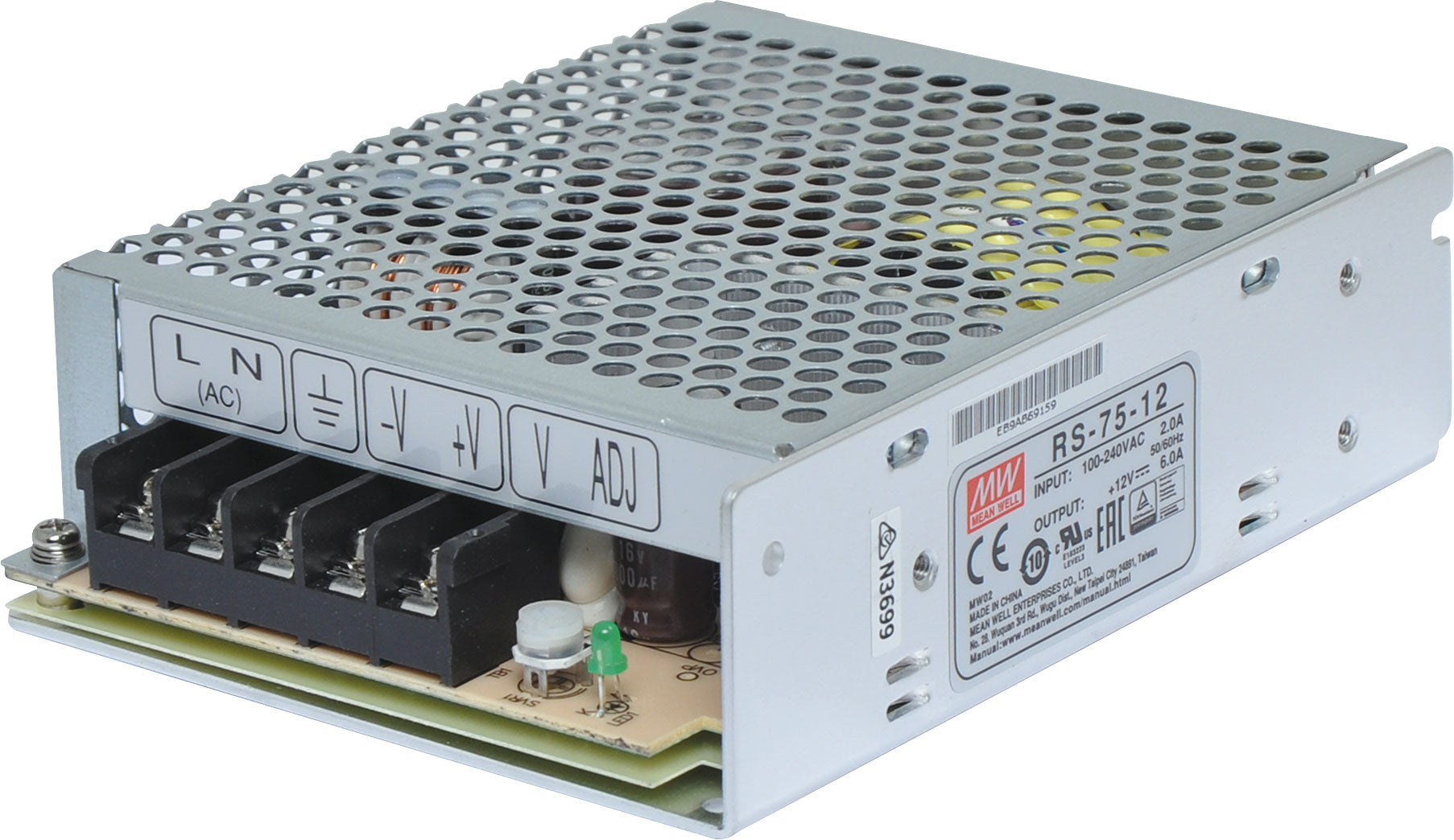 The Mean Well RS-75-12 has a rated output of 72W at 12V DC. This range of switch mode power supplies offer high efficiency DC power in a compact enclosure. They are designed to be installed within a secondary cabinet as the 240V input terminals are exposed. The mesh casing allows free air cooling without the need for fans (-25° to +70°C working temperature). The low profile casing makes them ideal for mounting into 1RU rack cases.