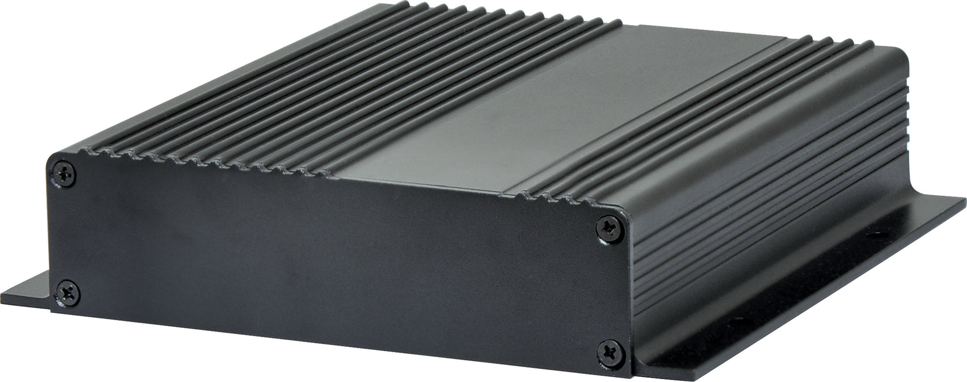 Extruded single piece aluminium case. Flat aluminium end plates can be milled, screened and customised to suit your requirements. Finned extrusion adds thermal dissipation for heat sinked applications. Two internal ribs for PCB mounting. Anodized black finish.