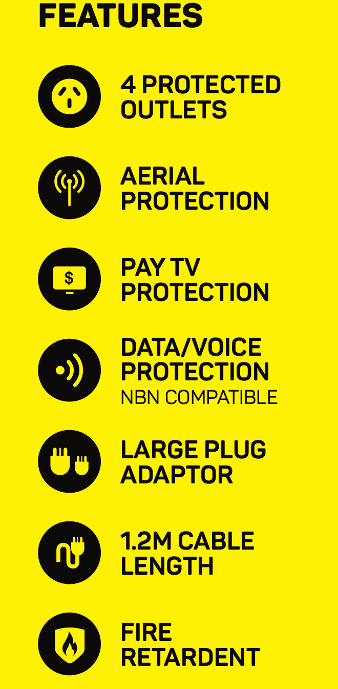- Protection modes (all 4 outlets protects on all 3 conductors). Active/Neutral, Active/Earth, Neutral/Earth