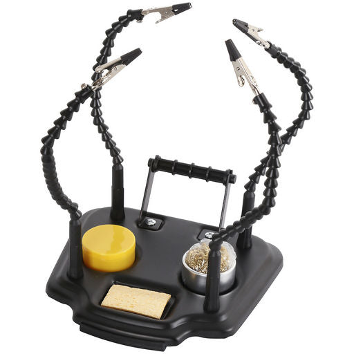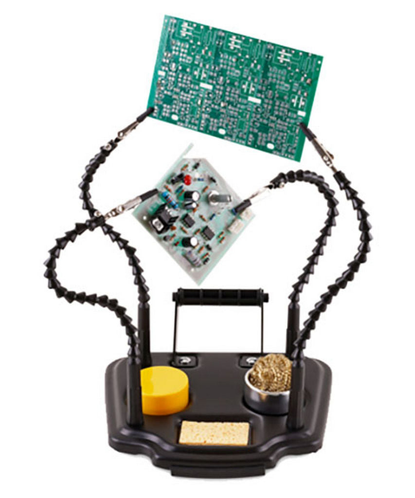 This PCB holder comprises of a powder-coated metal base with non-slip rubber feet It provides a sturdy base for mounting the 4 flexible and adjustable gooseneck arms with alligator clips. It holds a PCB board firmly while you are soldering. Includes a solder stand, cleaning ball, sponge and rosin.