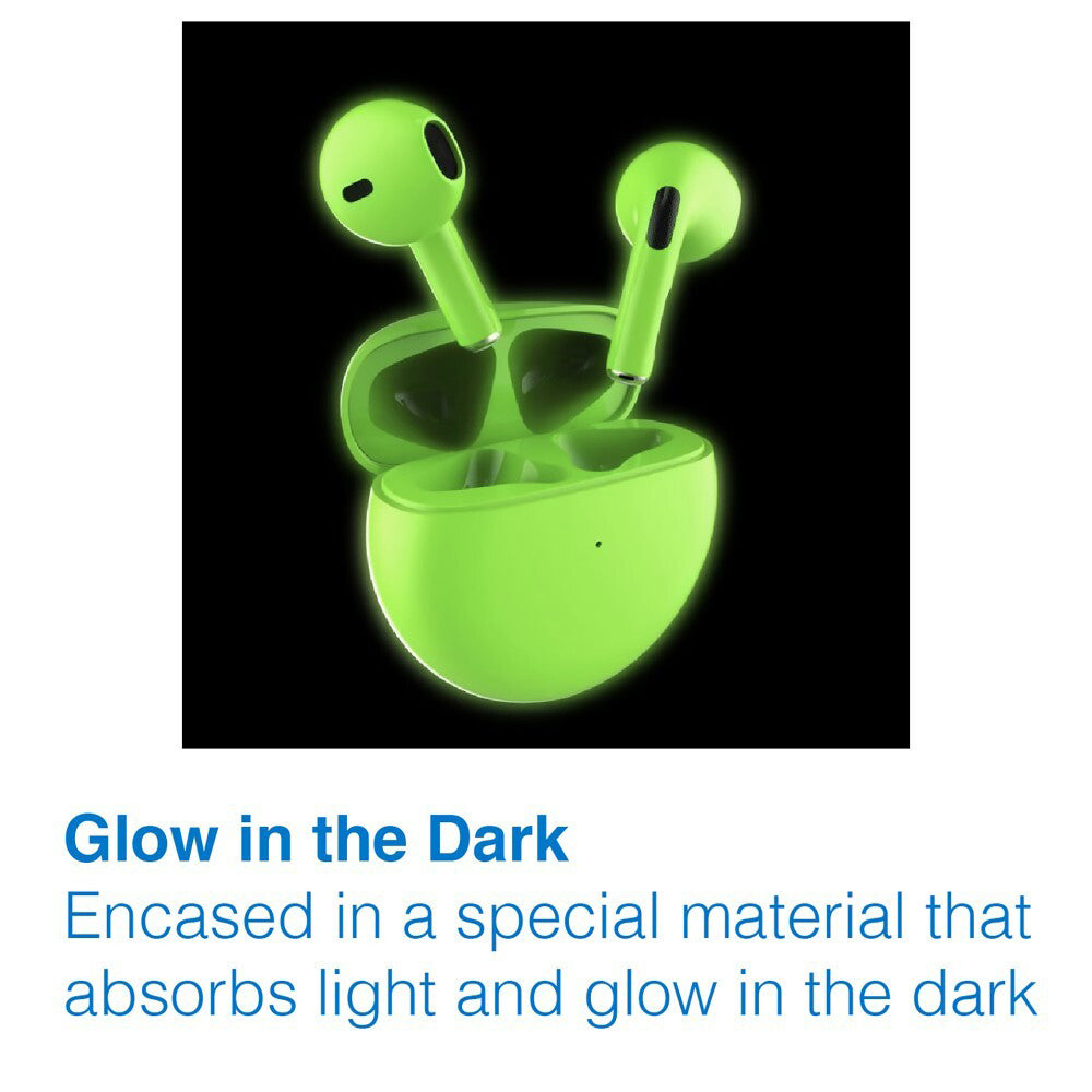 - Glow in the Dark – Encased in a special material that absorbs light and glow in the dark. Both earphones and charging case are encased in a special material that absorbs light to glow in the dark all on their own.