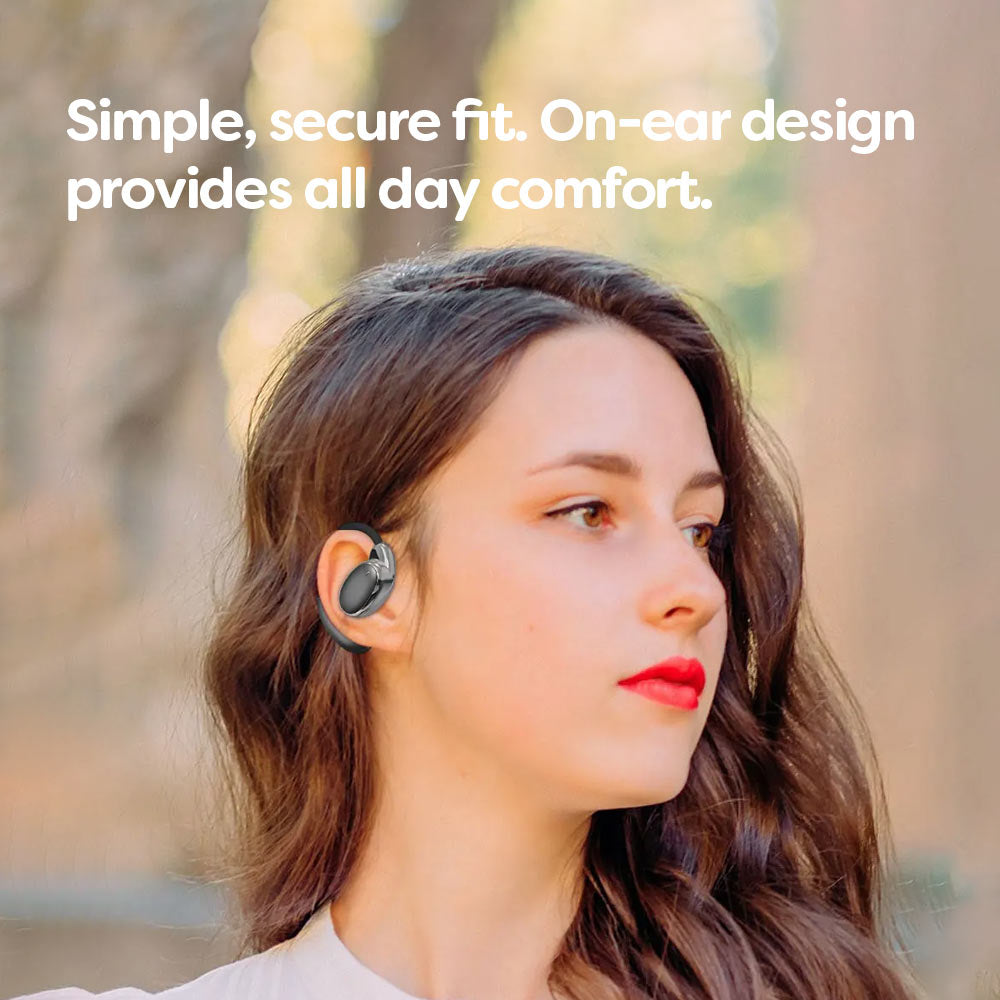 Hate in ear earphones? No worries! These wireless bluetooth 5.3 open ear (OWS) headphones are perfect for you - they’re sweat resistant, light weight and provide 8hrs of listening time. Great alternative to Apple Airpods! Ideal for excercise, listening to music in public spaces and around the home. Includes charging case. Bluetooth 5.3 offers excellent audio quality, connection reliability and speech clarity when using for phone calls. Compatible with virtually any Bluetooth device, including Anrdoid and Apple iOS devices.