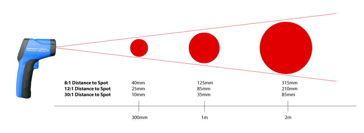 An example of how to use spot ratio follows. If you are measuring a target area of approximately 125mm diameter wide (e.g imagine the area of a man's clenched fist), and your IR thermometer has a spot ratio of 8:1, then the maximum distance you can accurately measure temperature is maximum 1.0 metres (i.e.: 8 x 125mm = 1000mm - see illustration below). Beyond this distance the thermometer will also be measuring the temperature of the area outside the 125mm target diameter, which will obviously deliver a less accurate reading.