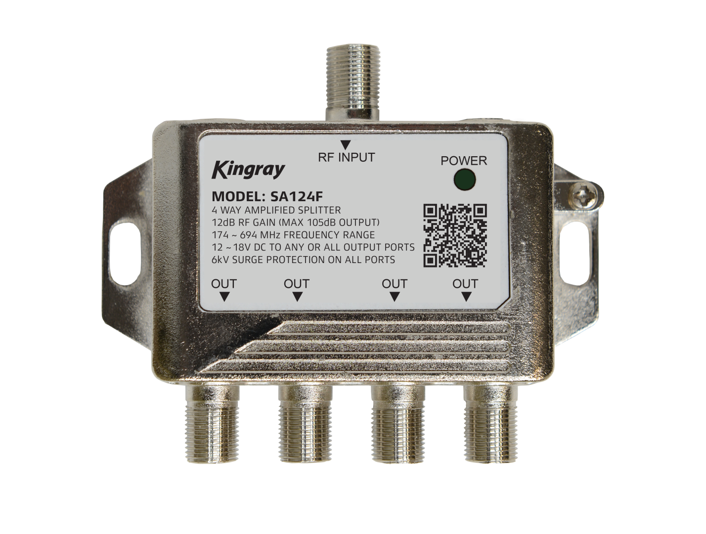 TV Signal Amplified Splitter with 12dB Gain, Single Input with 4 Outputs, Frequency Range of 174 ~ 694 MHz and is powered remotely via supplied power supply.The Kingray range of amplified splitters have been designed to have superior performance for today’s digital television signals.