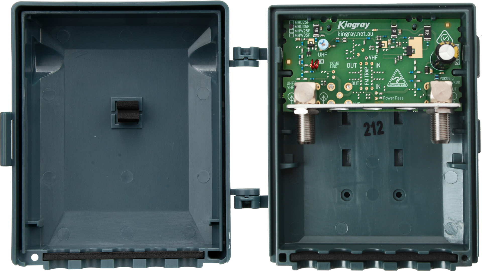 The Kingray Masthead range includes both wideband and VHF or UHF only models & with UHF frequencies above 694 MHz filtered, 4G/LTE transmissions are filtered out. In addition to the 4G/LTE filtering, most wideband models include low band filtering to eliminate all services below 174 MHz. This amplifier also has the ability to allow FM radio signals to be passed through.