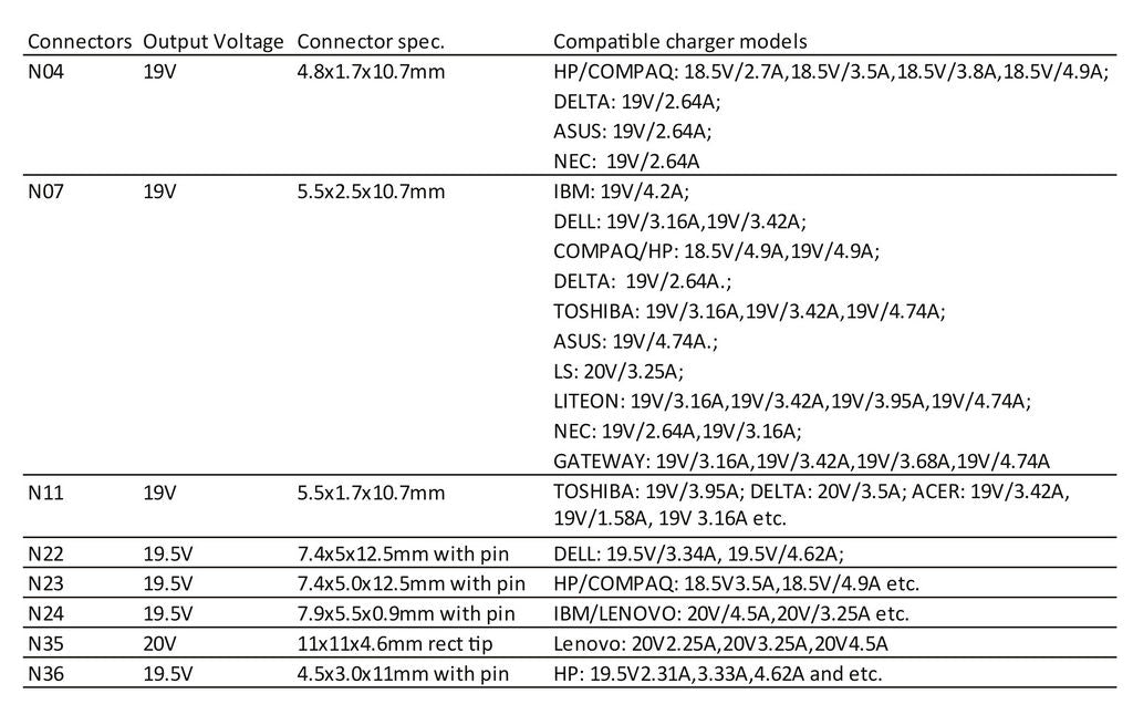 N07 19V 5.5x2.5x10.7mm IBM: 19V/4.2A; DELL: 19V/3.16A,19V/3.42A; COMPAQ/HP: 18.5V/4.9A,19V/4.9A; DELTA: 19V/2.64A.; TOSHIBA: 19V/3.16A,19V/3.42A,19V/4.74A; ASUS: 19V/4.74A.; LS: 20V/3.25A; LITEON: 19V/3.16A,19V/3.42A,19V/3.95A,19V/4.74A; NEC: 19V/2.64A,19V/3.16A; GATEWAY: 19V/3.16A,19V/3.42A,19V/3.68A,19V/4.74A