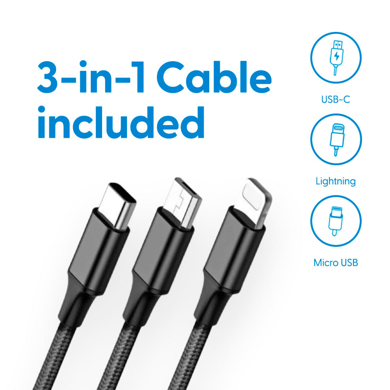 3-in-1 Cable Included: No need to stress about carrying multiple cables for your phone, tablet, earbuds, and more. The included 3-in-1 cable ensures a connection for USB-C, Micro-USB, and Apple Lightning devices
