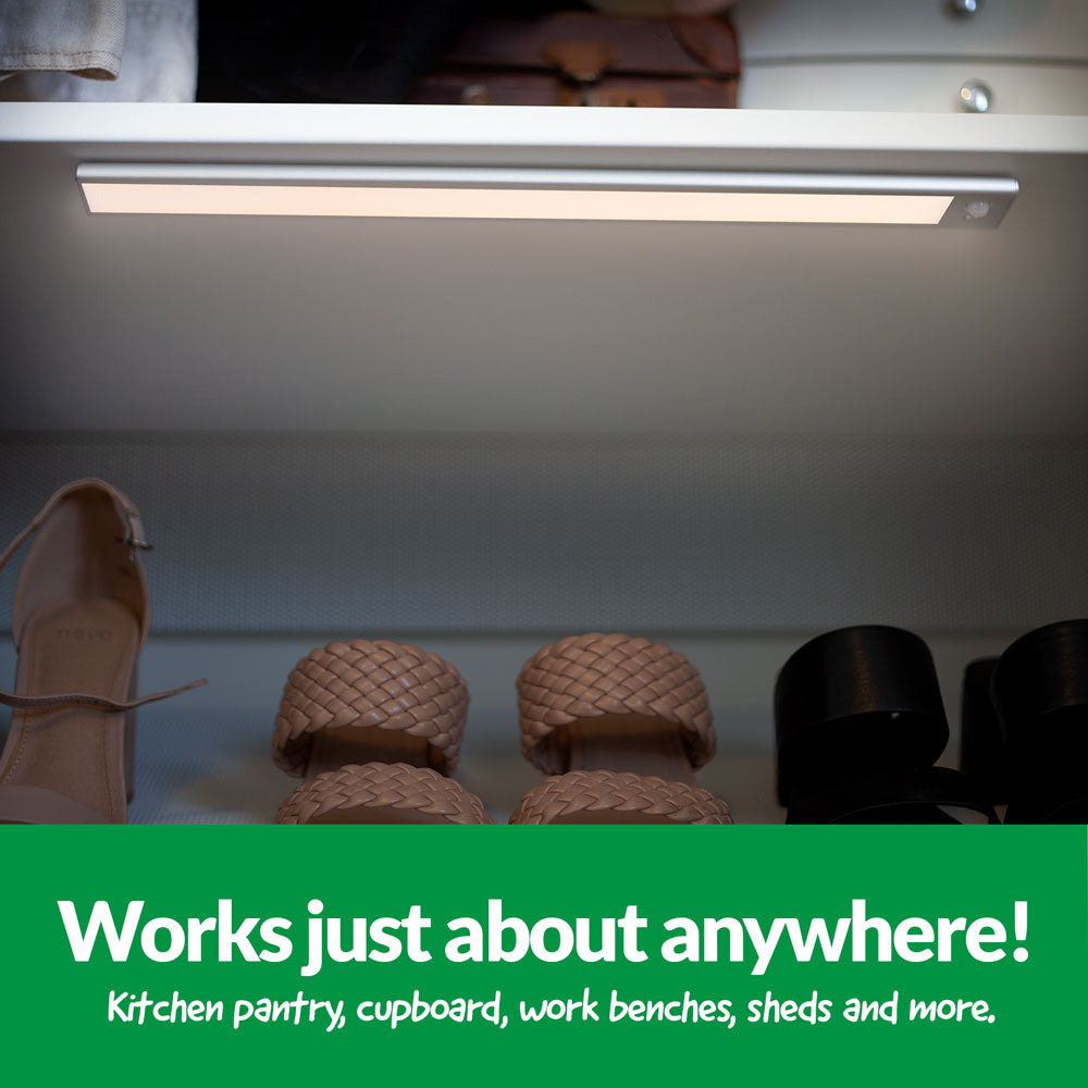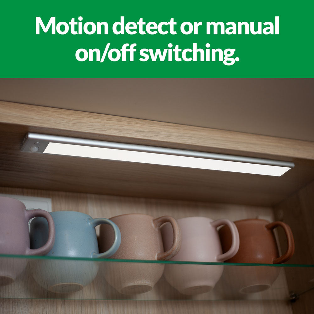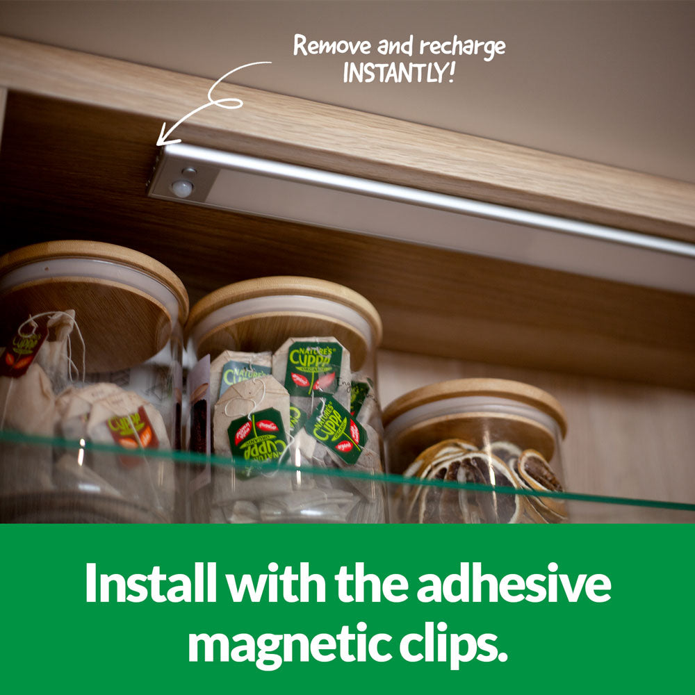 This USB rechargeable light is ideal as kitchen pantry, work bench or cupboard light thanks to its in-built PIR motion sensor (3-4m detection range). It can be set to activate day or night, night only or manual on/off.