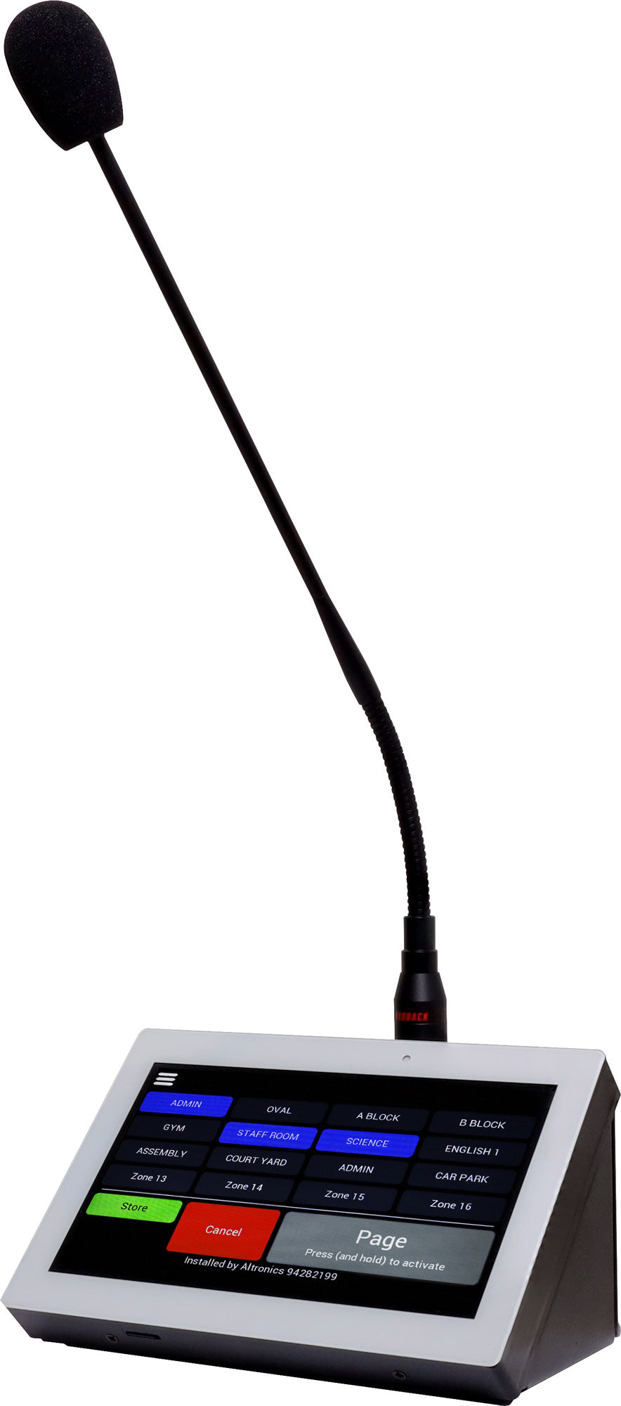 This 7" touchscreen LCD paging console provides paging control to a host of Redback products. No matter which product it is connected to, the console provides a central point of control for paging activation with useful features in-built such as pre and post announcement chimes, adjustable automatic microphone gain (AGC) control and output level control.
