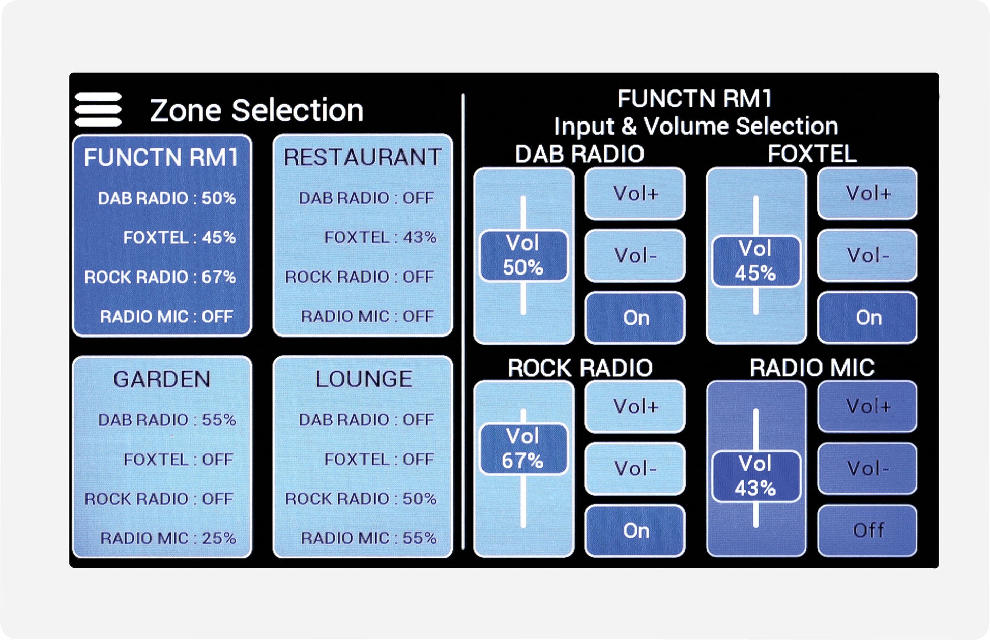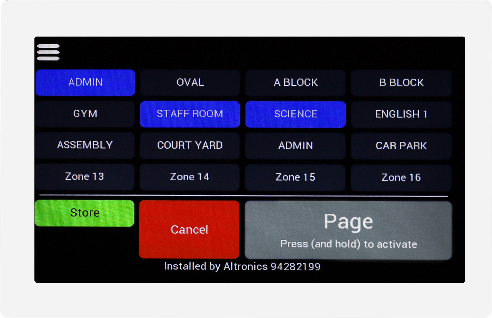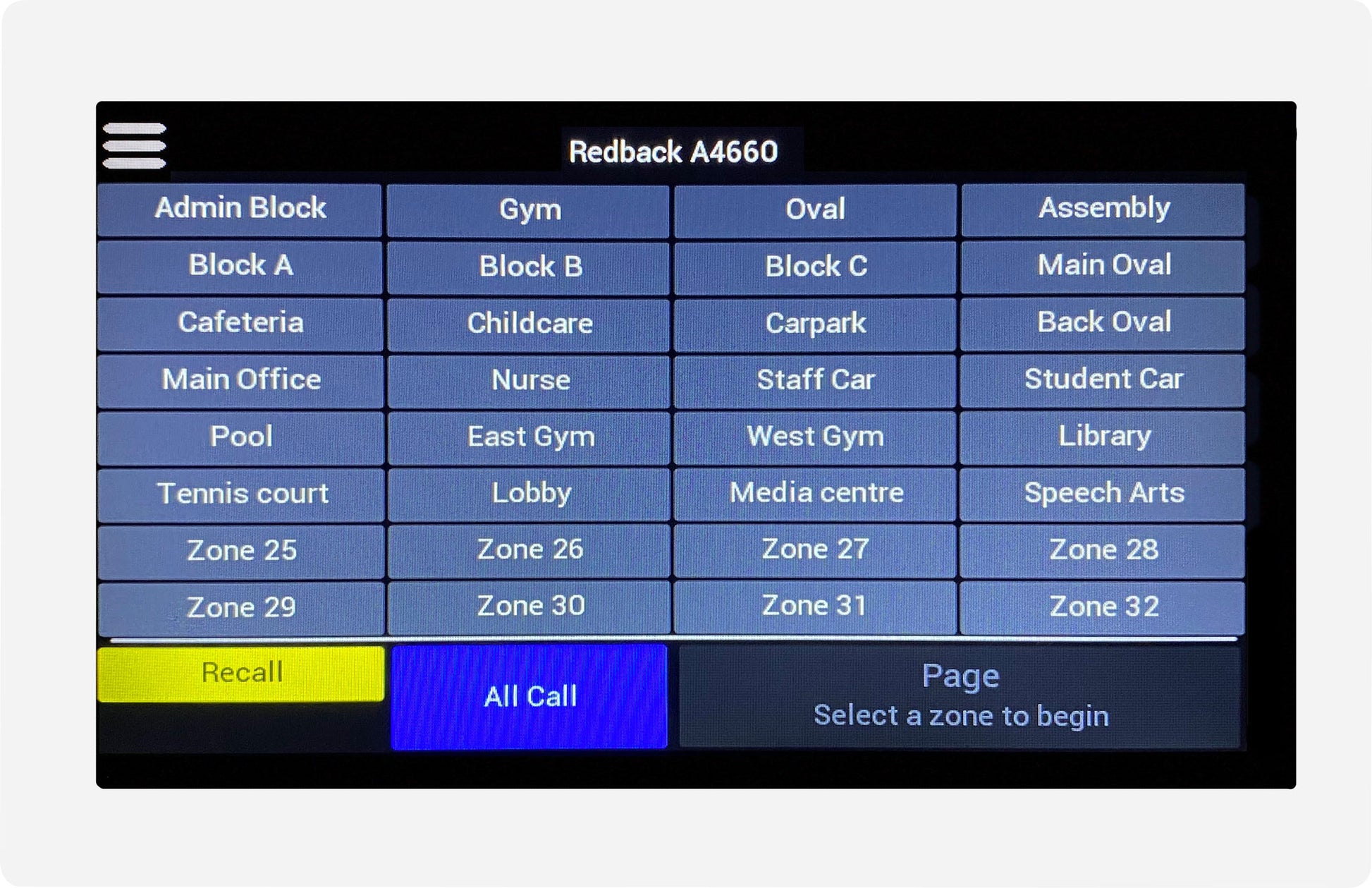 Plus on designated Redback products the settings menu allows for selection of button colour theme, zone labelling, input and installer renaming. It also allows you to adjust haptic button feedback, screen sleep settings, backlighting/dimming timers. To facilitate simpler paging, it offers the ability to record announcements, provide announcement playback, store and recall multizone selections.