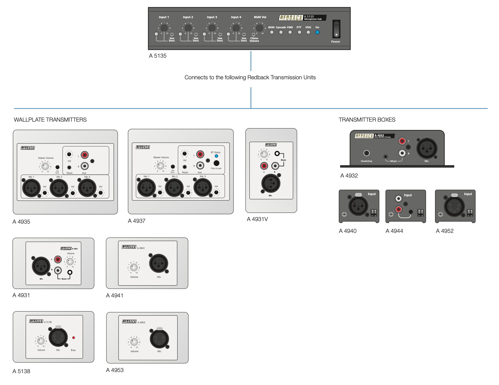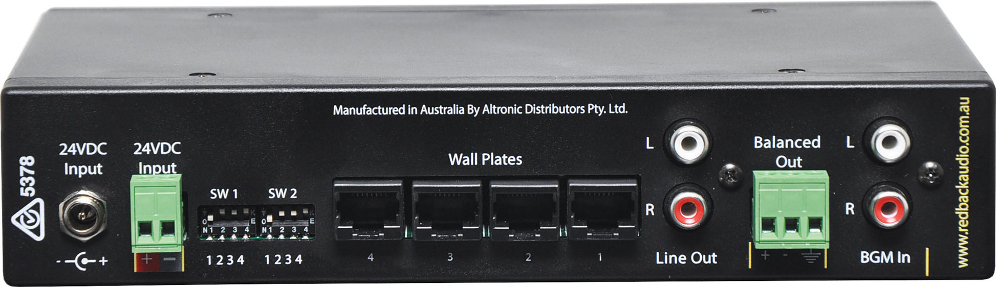 - Connects to four paging microphones via A 5138 wallplates or other Redback UTP transmitter at each location