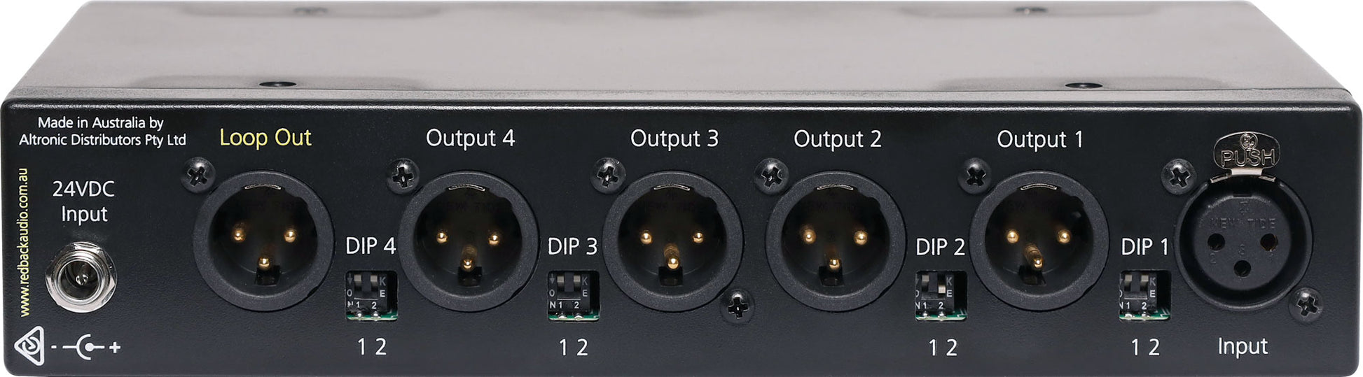 This compact half rack distributor comprises of a single 3 pin balanced XLR input to four 3 pin balanced XLR outputs. Great for splitting a single audio source out to multiple zones without interference between channels. The input and all outputs can be configured individually for either mic or line level operation. Front panel volume and recessed treble and bass controls are provided for each output. A “loop” output 3 pin XLR socket is provided to connect additional units to increase the total number of outputs as required. It is housed in a half rack 1RU cabinet and powered by 24V DC power source (power supply included).