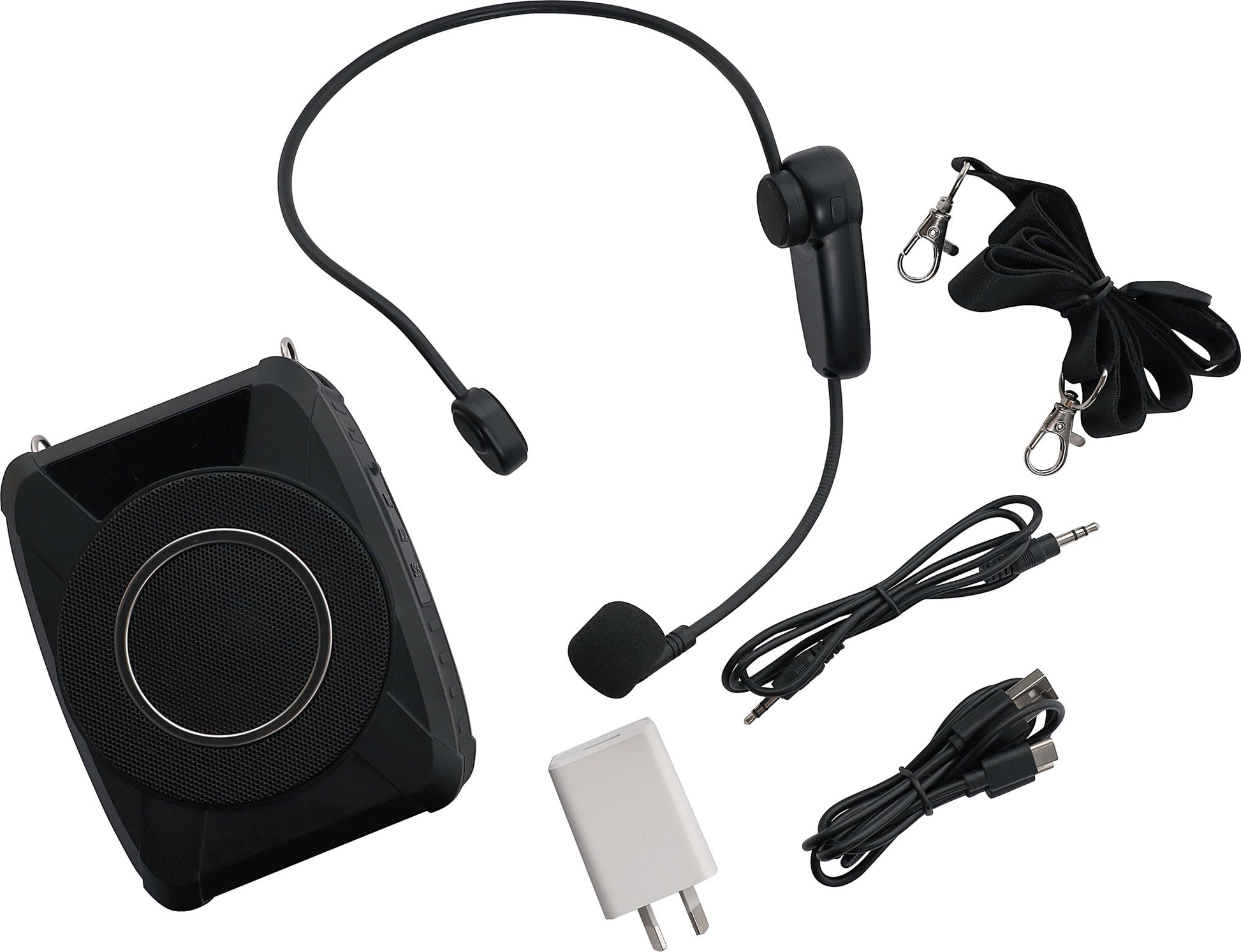 A compact portable PA system with headset, providing a way to increase the volume of your voice when addressing small crowds. The speaker can be used with the included adjustable belt/shoulder strap or freestanding to provide additional clarity wherever you need it. For example, a trainer could place the speaker in the middle of the room so everyone can hear clearly.