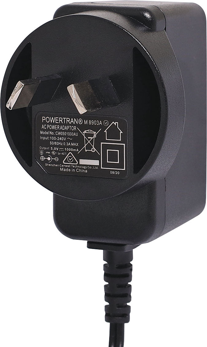5V DC, 1 Amp switch mode plug pack supplied with a fixed positive to tip 2.1mm DC jack (2.1ID x 5.5OD x 10L). Compact design with high current regulated output. Energy authority approved. MEPS approved. Dimensions: 40W x 52H x 41D mm