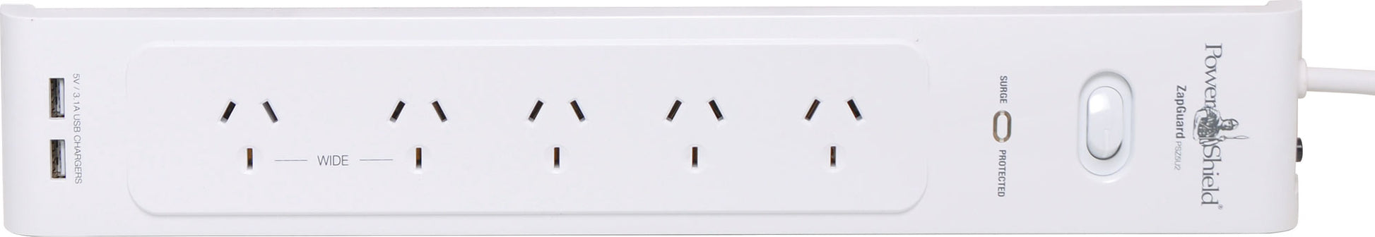 This Powershield Zapguard Surge Protected 5 Way Power Board with 2 USB ports will protect your home and office electronics from dangerous surges and spikes and is ideal for charging mobiles, laptops and other small USB powered devices. It is highly rated to withstand power surges and spikes of up to 1,400 Joules / 40,000 Amps. It features a wide spaced socket to allow for plug packs and also has the option to be wall mounted.