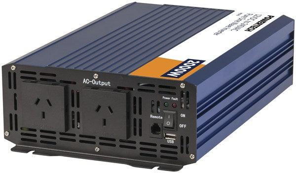 This pure sine wave inverter is suitable for mobile or permanent power installations. It is capable of providing 2000W continuously, with a 2400W max power start for 10 seconds and a 4000W surge. Ideal for powering microwaves, power tools, TVs, and other power thirsty devices when you are away from mains power.