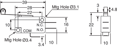 SPDT 39mm roller lever micro switch. Momentary action. Ideal for replacement or new mechatronic designs. Suitable for limit switching in a variety of industrial and hobbyist applications. 4.8mm spade connection is suitable for soldering or use with spade lugs.