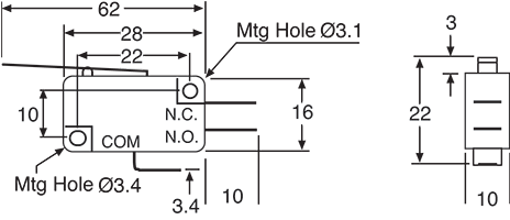 A momentary action microswitch with 51mm lever. Suitable for limit switching in a variety of industrial and hobbyist applications. 4.8mm spade connection is suitable for soldering or use with spade lugs.