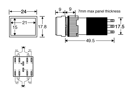 Terminal connections disconnect from the panel switch to allow switch to be mounted in a single 16mm round hole (15.8mm flat sides).