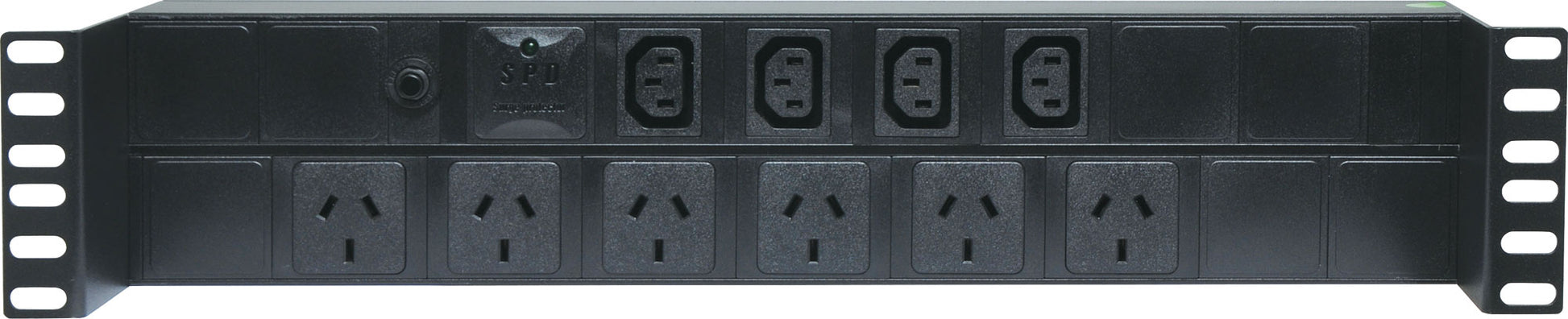 The neat solution to supplying mains power to your rack mounted equipment. Simply screw this panel to your rack and plug the equipment in. This 2RU model now offers surge protection for 10 power outlets consisting of 4 IEC sockets and 6 Australian Main sockets. Includes overload circuit breaker. Fitted with a 2m heavy duty 10A lead. This product is SAA approved.