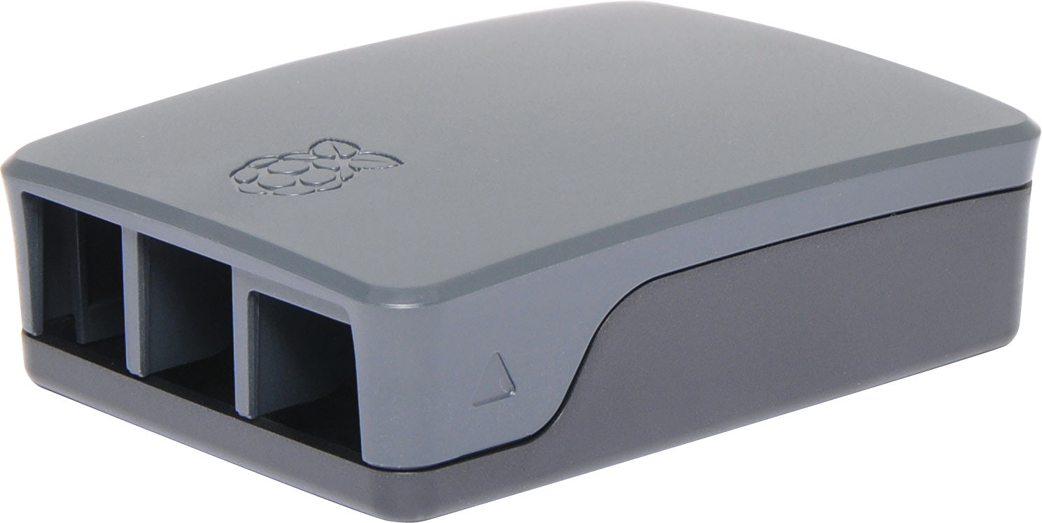 A compact, snap together black and grey case to suit the Raspberry Pi 4 Model B development board. Designed with all connection recesses and venting.