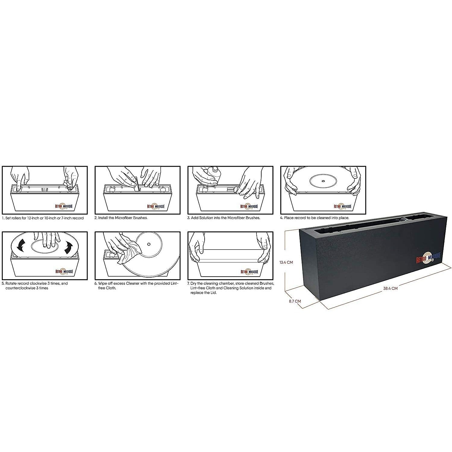 - Quick and Easy to Set up 1.Set the two rollers for 12” 10” or 7” records, 2.Install the two microfiber brushes. 3.Add solution onto the microfiber brushes, 4.Place a record to be cleaned into place, 5.Rotate record slowly three times clockwise and then three times counter clockwise, 6.Wipe off excess cleaner solution with the provided lint-free cloth, 7.Dry the cleaning chamber, store cleaned brushes .lint-free cloth and cleaning solution inside and replace with the provided Lid.