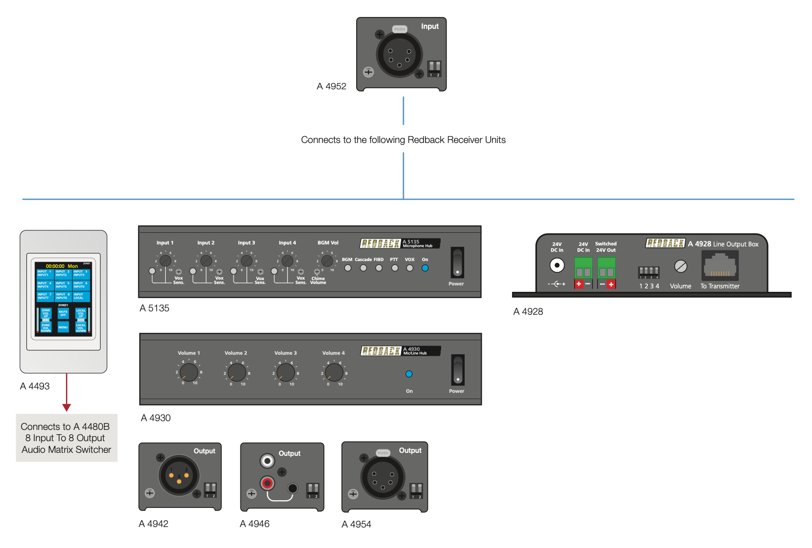 The Redback A4952 can be connected to compatible Redback products such as the A4954. These units send the balanced signal and push-to-talk (PTT) to the A4954 ensuring seamless operation for paging microphones (PTT connects to pins 4 and 5 of the XLR socket).