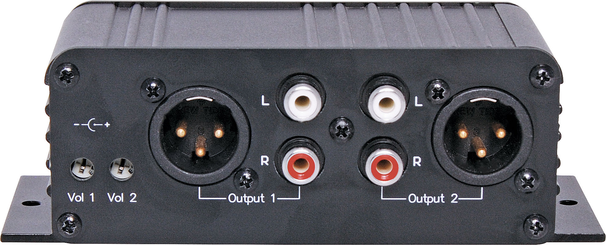 A 3 pin XLR with output adjustable to either 3mV or 1V and a dual RCA configurable to either 100mV or 1V. This enables the user to select a number of input to output signal configurations to suit their application. All input/output sensitivity adjustments are by set and forget DIP switches. Volume controls are provided for each output. The unit operates from an external 24V dc source.