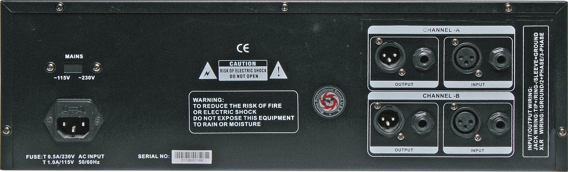 It also includes feedback LED indicators for each channel. This allows feedback to be reduced or eliminated by “notching out” ie. reducing the system frequency response at the offending frequency sector. Usually connected between the pre amp out and power input of the sound system amplifier. High pass selectable filter switch provide 12dB per octave below 40Hz. 3 pin XLR and 6.35mm sockets offer balanced connections. A switch is provided to bypass all control settings. Overall output is controlled by the level control.