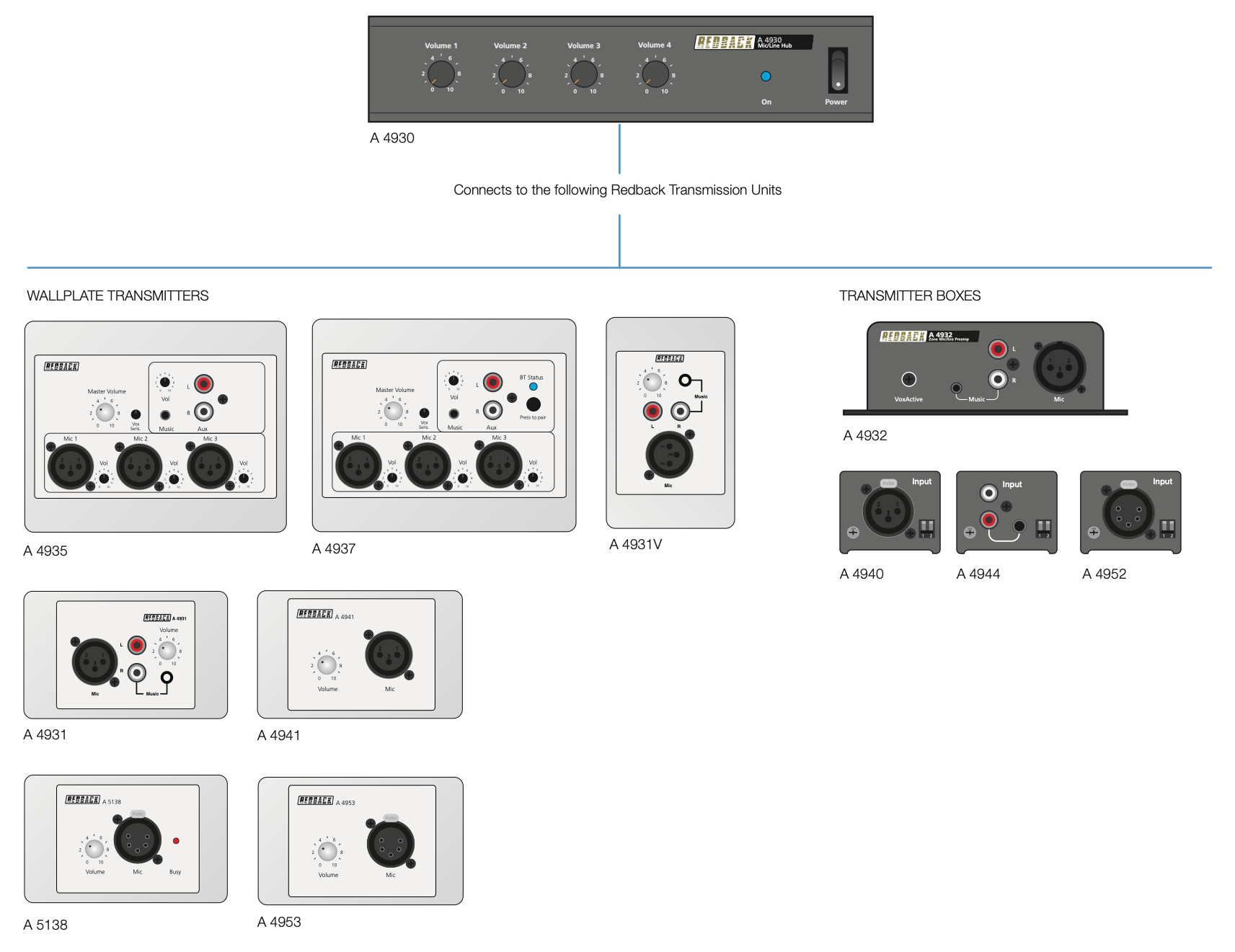 The receiver hub has a dedicated output for each transmitter, with front mounted volume controls for each output. Each output can be DIP switch selected to be fed to a dedicated mixed output. Each output including the mixed output has DIP switch selectable balanced mic/line, or unbalanced line level outputs which can be fed directly into amplifiers. The hub is powered by 24V DC from the supplied plugpack.