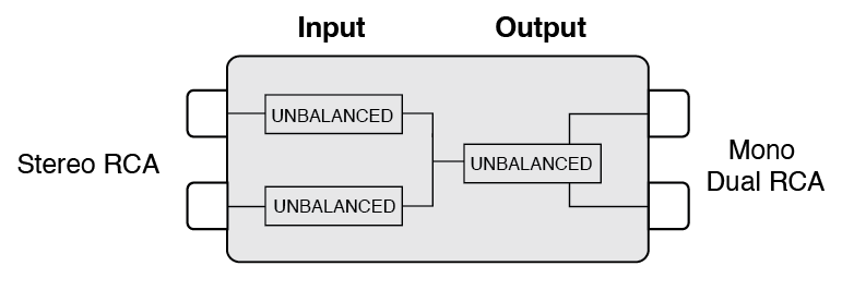 This unit is designed to convert stereo audio signals into a summed mono line level RCA signal.
