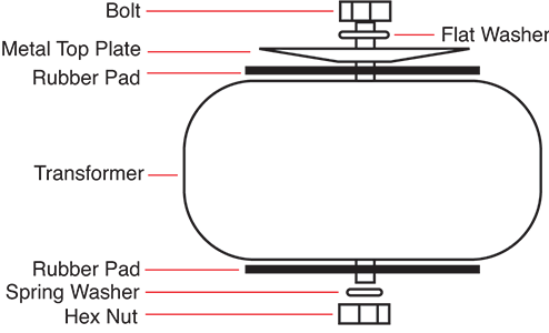 - Each toroidal is supplied with 2 x rubber spacing washers, 1 x steel dished washer, 1 x mounting bolt, 1 x nut (except PCB mount versions).