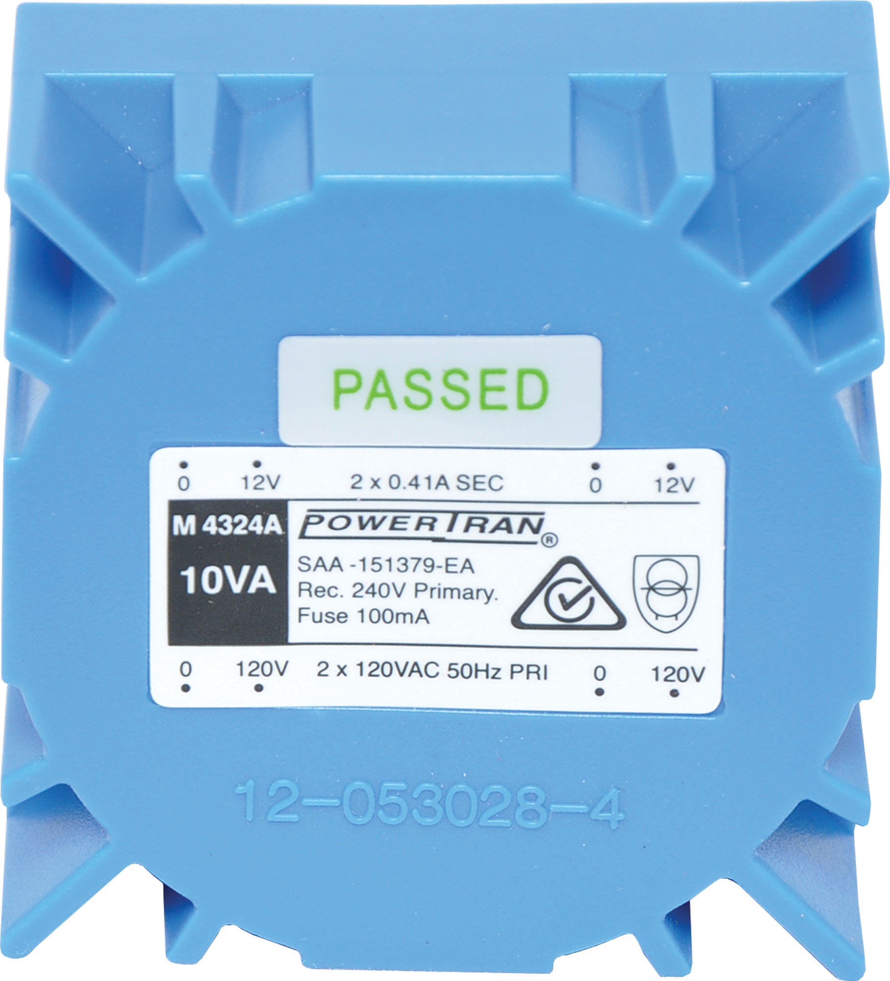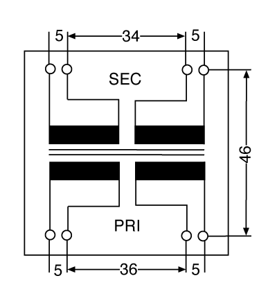 The transformer is “potted” in an epoxy compound within a plastic housing. Configured with 2 x 120V primaries and 2 identical secondaries which can be wired in either series or parallel. Being PCB mount reduces assembly time as the transformer simply solders to the PCB. For extra stability and mechanical reliability the transformer can be secured to the PCB with a self tapping screw.