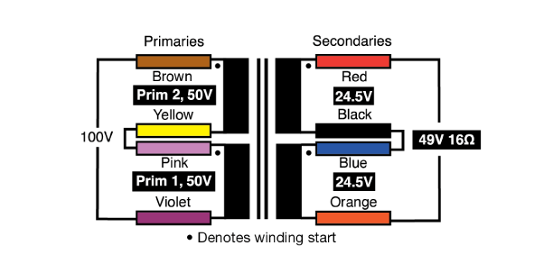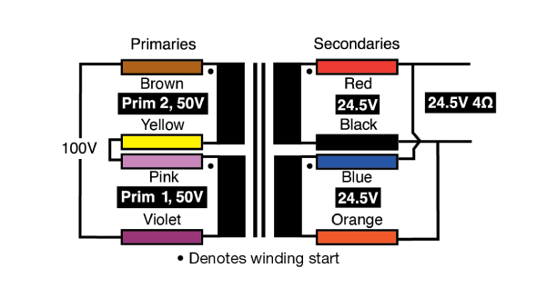 For 100V line use, connect in series, ie. join pink & yellow. Use purple & brown.