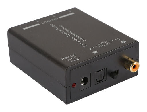 This switch splitter has 2 selectable inputs; a Toslink input and a Coaxial digital input. You can send the selected input source signal to 4x Toslink outputs. Suitable for home or professional audio distribution. AC Power supply is included.