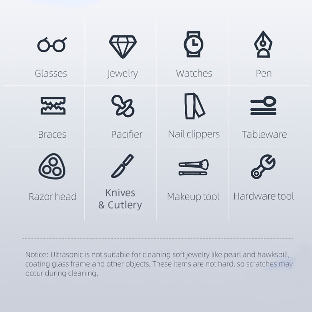 - Suitable for use with most mild ultrasonic wash solutions and household detergents.