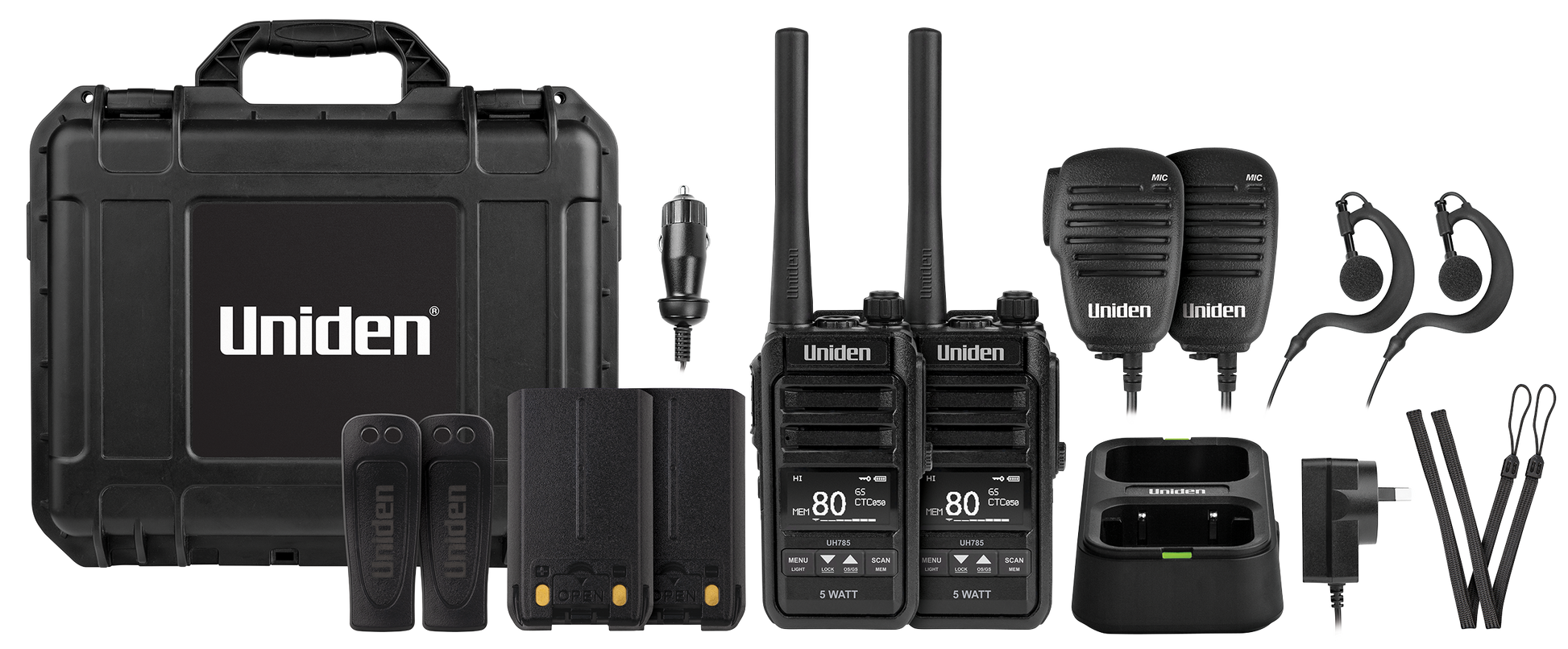 The UH785-2TP UHF CB handheld radio is a solid 5 Watt power twin set of UHF radios that can deliver up to 17km of range . This makes it the perfect unit for professionals who need a rugged and heavy duty radio suitable for various conditions. The Tradies Pack includes a host of accessories including Earpiece Microphones, Speaker Microphones, Car Cigarette Chargers plus more in all in a durable tradie pack.