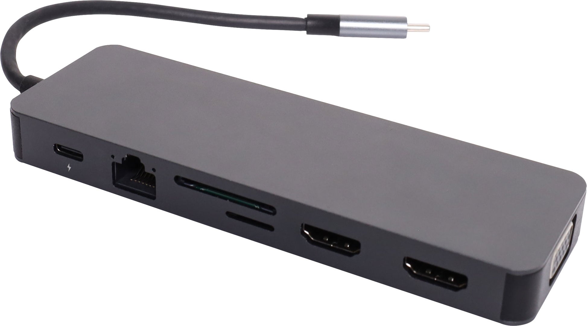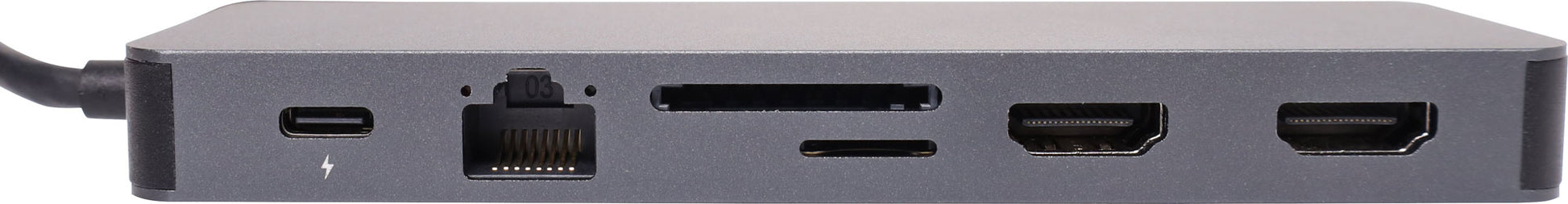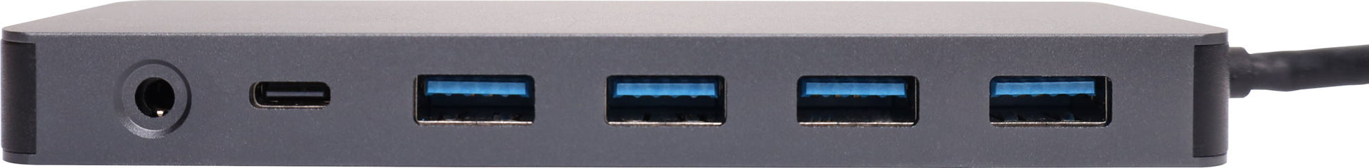 This handy hub features USB C connection to your laptop and provides 4 x USB 3.0 type A ports, USB C port, 2 x HDMI ports, SD/microSD card slot, 3.5mm headphone out, wired gigabit ethernet interface and VGA connection. Provides PD pass through charging up to 100W. Supports dual monitor connection at 4K @ 30Hz max.