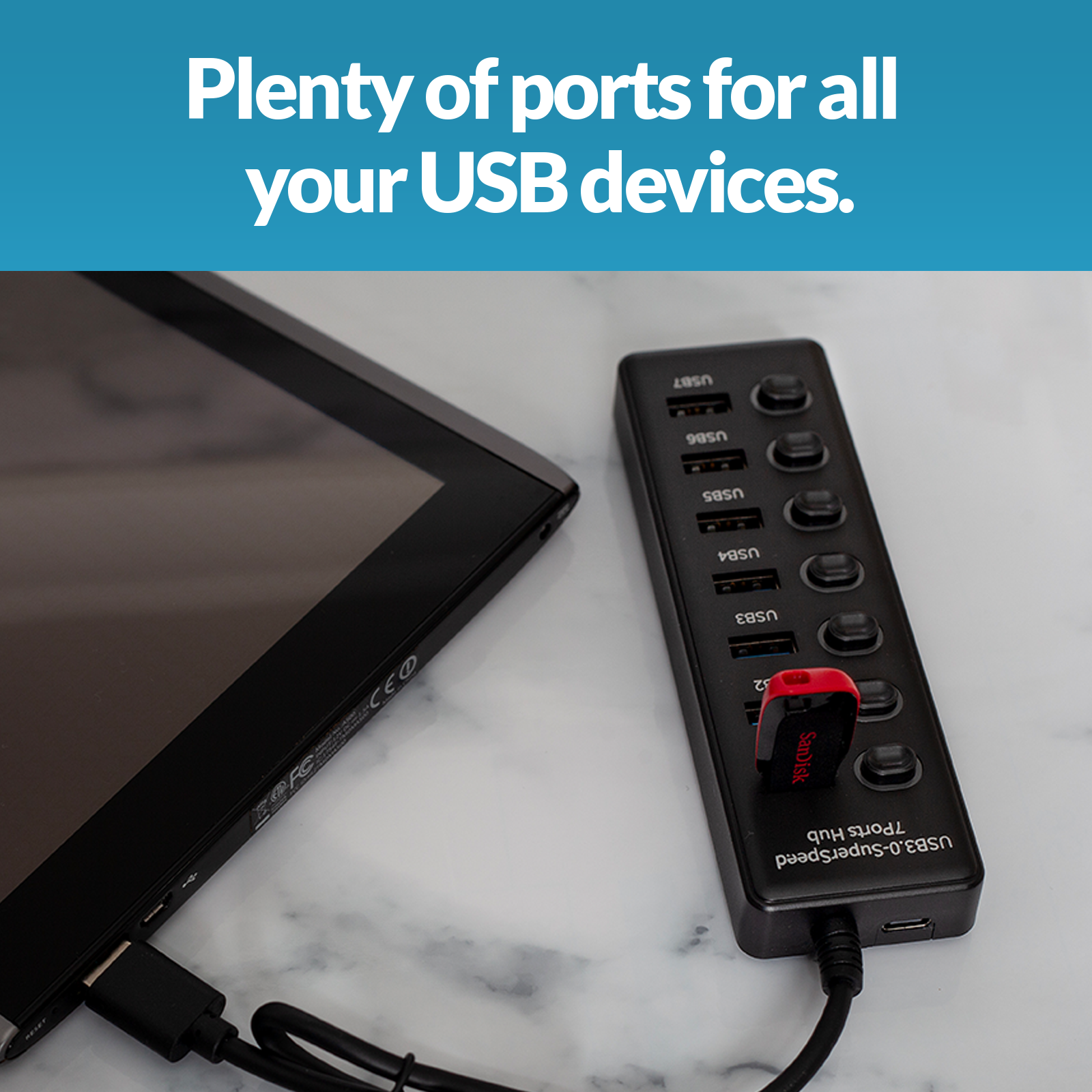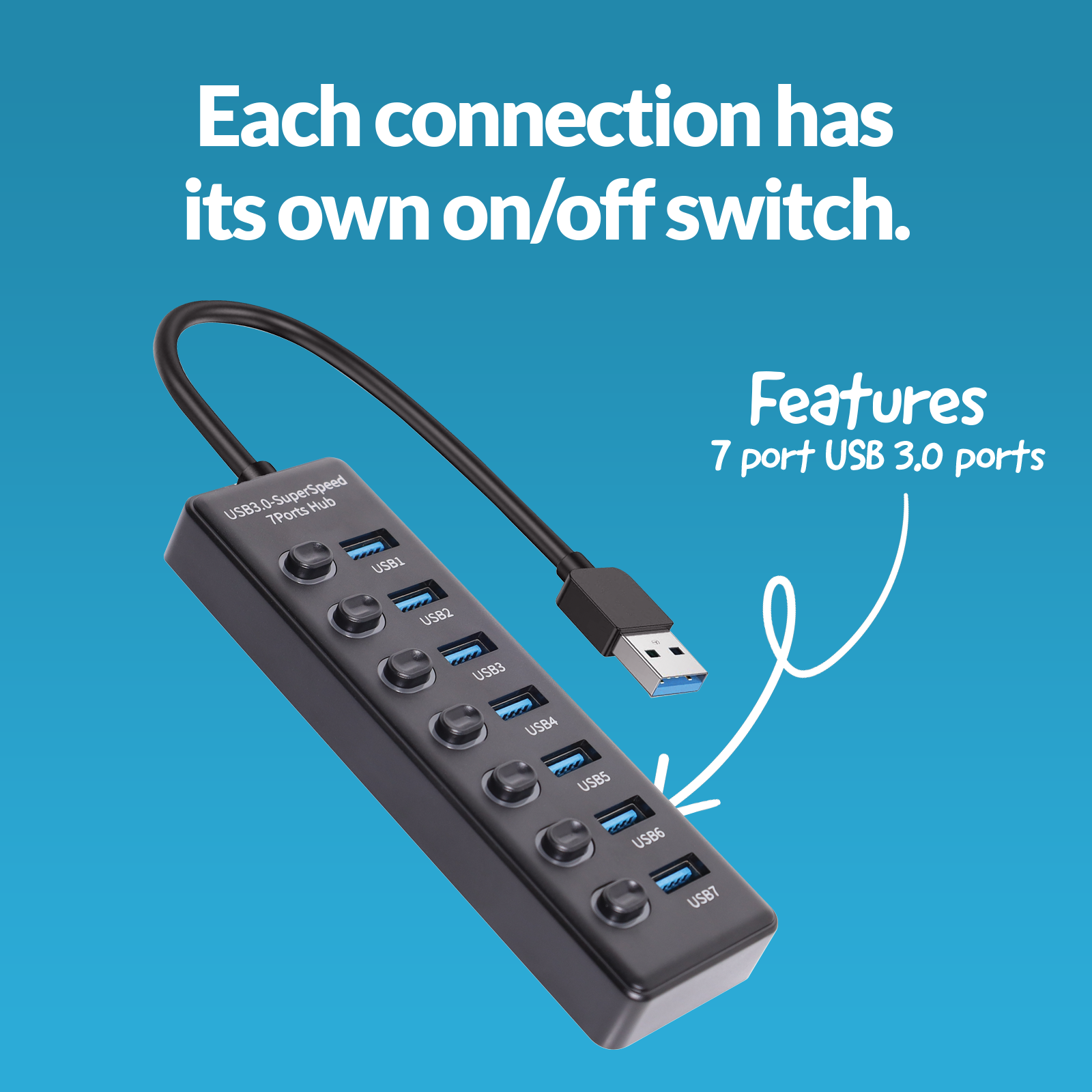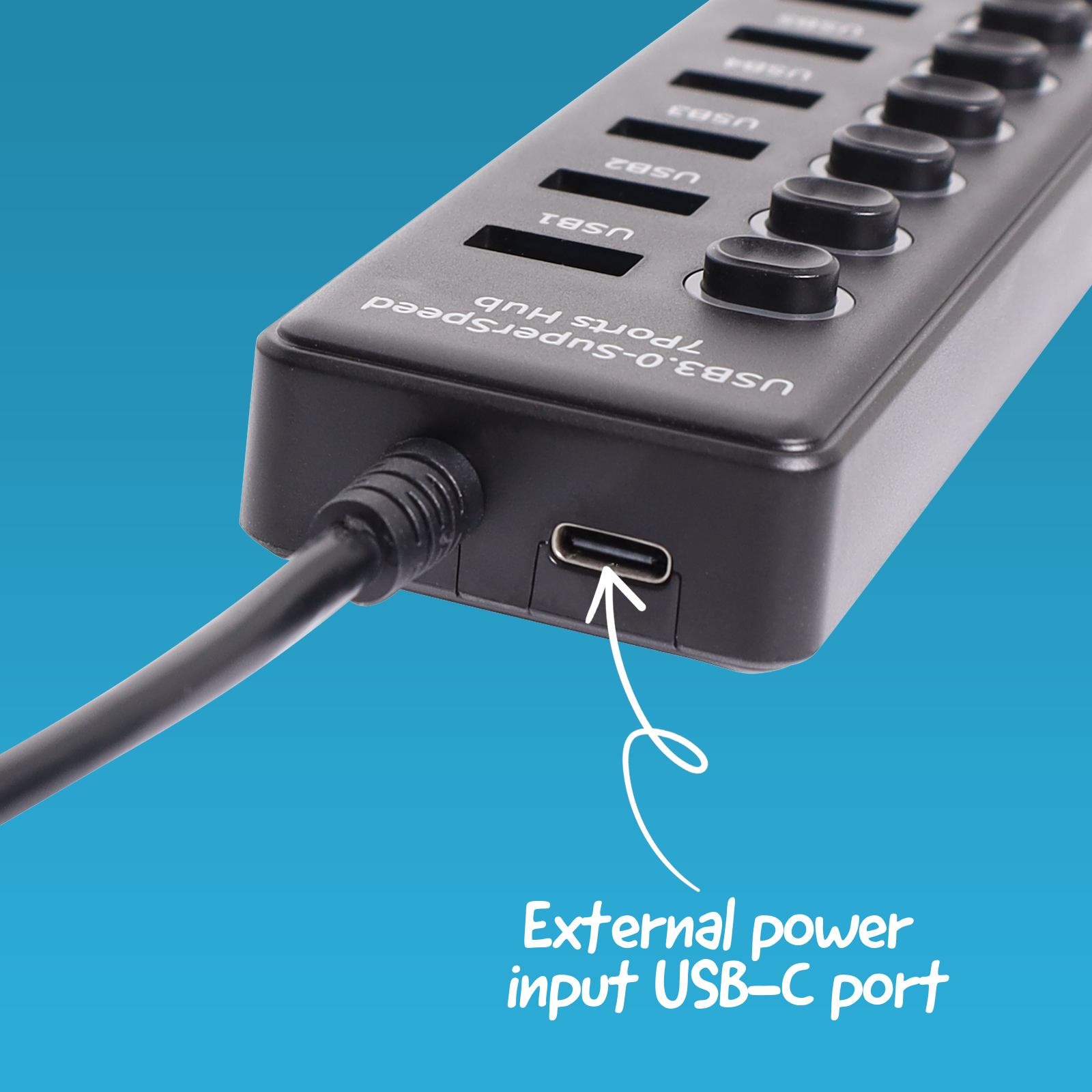 A handy 7 port USB 3.0 hub for those with lots of peripherals! Each connection has a dedicated on/off switch. USB type C power input with type A connection to your computer.