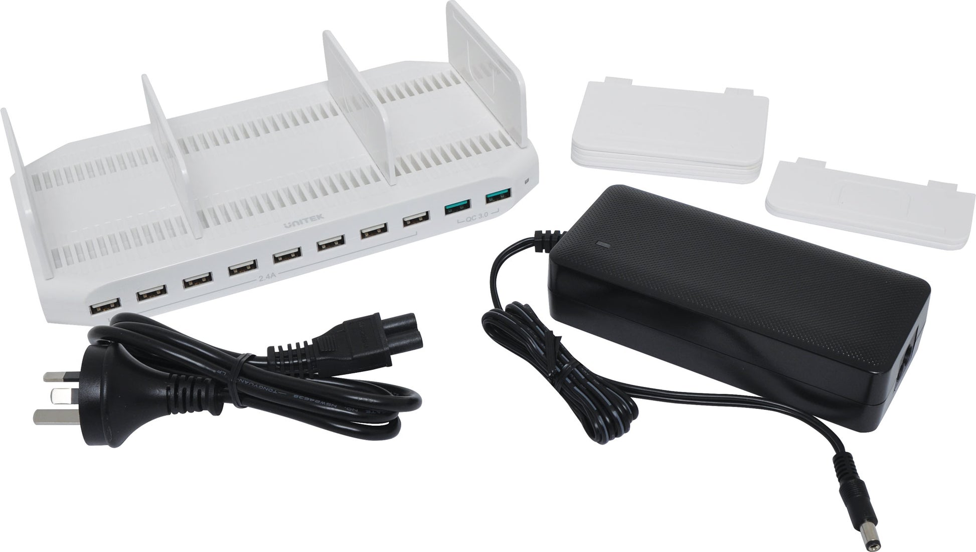 This 10-port USB charger allows you to charge up to 10 devices at once. It features 10 5V USB charging ports providing up to 96W of charge capacity across all ports (19.2 Amps). This model also features 2 QC3.0 USB ports ideal for devices that need to be charged quickly.